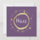 Difunde el mensaje de paz en esta temporada navideña. Un hermoso diseño moderno de estrella dorada rodea la palabra Paz. Fondo violeta púrpura. Agrega tu mensaje personal. Tarjeta perfecta para enviar a familiares y amigos para que sepan que estás pensando en ellos durante la temporada navideña.