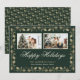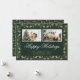 Tarjeta de vacaciones feliz elegante verde y dorada con foto que incluye acebo dorado en un fondo verde oscuro. Personalice fácilmente esta tarjeta de vacaciones con sus fotos favoritas y el nombre de la familia.