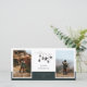 Tarjeta de foto de vacaciones de estilo escandinavo moderno y rústico. Dos espacios verticales de fotos. Rama acuarela adornada con pinecones y adornos decorativos de estrellas, diseño de tipografía de moda con respaldo de estampado a la moda.