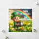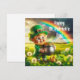 Tarjeta de vacaciones Feliz Día de San Patricio con un duendecillo lindo sosteniendo una olla de oro en un campo de tréboles y un arcoíris