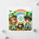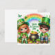 Tarjeta de vacaciones feliz día de San Patricio con un niño y una niña lindos, ollas de oro, tréboles, flores, animales y un arcoíris