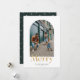 Moderna tarjeta de Navidades fotográficos Golden Merry Arch. Relieve metalizado falso dorado "Merry", marco moderno de fotos en arco y respaldo rústico de patrón verde del bosque.