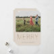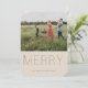 Moderna y elegante "MERRY" dorada, tarjeta fotográfica de vacaciones. La tarjeta incluye una foto en la parte delantera y trasera y varias líneas para el mensaje, los nombres y el año de su personalizado. El color de fondo, la arena rosa mostrada, se puede personalizar.