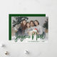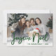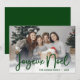 Esta preciosa tarjeta de foto con tu foto, las palabras "Joyeux Noel", en un moderno guión con un color verde oscuro y el nombre de tu familia, y el año con un tipo de letra crujiente y verde oscuro en la parte delantera y una parte de atrás verde oscuro y coordinada le darán una sonrisa a la cara de cada receptor. A todos les agradará tener una nueva foto de ustedes y de su familia o de sus hijos. Para hacer de esta tarjeta su propia, simplemente seleccione Personalizar esta plantilla, subir una foto favorita, añadir su apellido y el año. ¡Es muy fácil!