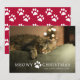 A este gato le encanta la tarjeta de vacaciones con la frase "navidades miedosos" en blanco con una pequeña huella de pata blanca en medio de las dos palabras. La parte posterior es un patrón de impresión de pata roja y blanca.
