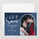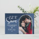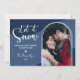 Elegante tarjeta de vacaciones de navidades azules con tu foto en forma de globo de nieve, con un efecto de nieve en invierno, el dicho festivo "déjalo nevar", saludo de temporada, tu nombre y el año.