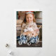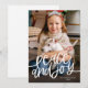 Una sencilla tarjeta de vacaciones que presenta las palabras “paz y alegría” en una escritura a mano y su foto favorita.
