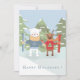 Adorable tarjeta de Navidad plana para niños con un oso polar y su amigo reno preparándose para ir a esquiar . Personalízala con tu propio texto y la firma de tu familia .