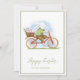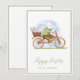 Tarjeta de vacaciones plana "Happy Easter" con una foto de un conejito en una bicicleta.