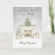 Tarjeta de felicitación navideña para tu hermana y su familia. Este diseño presenta un ilustracion acuático con chimenea festiva y regalos. Al fondo hay una escena de invierno.