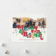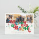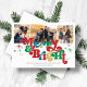 Estas lindas tarjetas de felicitación para festividades fotográficas de 7" x 5" presentan el brillante y colorido saludo retro, "Merry & Bright", en rojo, verde y dorado con marcadores de posición para tres de tus fotos favoritas.