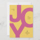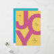 Esta tarjeta de vacaciones sin foto presenta una tipografía en negrita y una paleta de colores festivos. La tarjeta de Navidad presenta la frase "Enviándote alegría esta temporada de vacaciones", con la palabra "Alegría" escrita en letras rosadas en negrita sobre un fondo amarillo brillante. Agrega el nombre de tu familia y el año en la parte inferior. La parte trasera de la tarjeta presenta un fondo azul teñido y espacio para escribir un mensaje personalizado o agregar fotos si lo deseas.