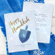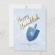 Celebra la temporada con esta deslumbrante tarjeta Hanukkah que incluye un brillante dreidel azul y elegante guión de oro "Happy Hanukkah". El fondo del efecto luminoso festivo agrega brillo y alegría, mientras que la parte posterior incluye un mensaje sincero para calentar los corazones de sus seres queridos. Personalice su nombre y año familiar para un saludo memorable. ¡Una manera perfecta de difundir luz, risas y amor durante el Festival de las Luces!