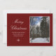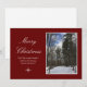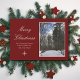 Feliz Navidad en la escena navideña tarjeta de saludo de vacaciones, con una escena de bosques de invierno después de la nieve recién caída. Si se establece en un fondo rojo, se puede personalizar con letras de guiones blancos. También puede añadir su propia foto si lo desea. Una tarjeta encantadora para enviar deseos de vacaciones a tus amigos y familia.