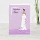 Tarjeta de felicitaciones de Debutante en una lavanda ligera con una jovencita negra con un vestido largo y blanco, y un rociado de corazones blancos en la esquina superior izquierda. Gracias al Hungryjpeg por algunos de los elementos del diseño.