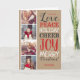 El personalizado asequible imprimió tarjetas de la foto del día de fiesta con las plantillas simples para el arreglo para requisitos particulares. Este diseño rústico moderno tiene una mezcla festiva de tipografía en rojo, blanco y gris en un falso fondo del papel de Kraft. La fraseología dice amor, paz, alegría del día de fiesta, alegría, y Felices Navidad. Personalícela con 4 de sus fotos a lo largo del lado y añada su apellido y el año. Dentro de tiene espacio para las fotos y el texto adicionales. Utilice las herramientas de diseño para corregir el texto, añada más fotos y cree único de un diseño de tarjeta bueno de la foto del navidad.