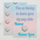 Esta elegante tarjeta de felicitación del Día de San Valentín presenta un suave fondo degradado rosa y azul pastel, acentuado con corazones brillantes de purpurina plateada en estilo 3D. Diseñada para parejas modernas, la parte delantera muestra un romántico mensaje "Tengo tanta suerte de tenerte" en tipografía elegante. Esta papelería personalizable te permite agregar los nombres del destinatario y del remitente, lo que la convierte en un recuerdo único. La parte trasera contiene un patrón coincidente de corazones metálicos flotantes sobre un fondo estético brillante. Perfecta para novios, novias o cónyuges que aprecian una estética contemporánea de "chica limpia" o "chico suave". Acabado de alta calidad impreso bajo demanda que garantiza colores vibrantes y detalles nítidos. Ideal para aquellos que buscan papelería romántica personalizada con un motivo de corazón metálico.