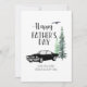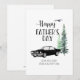 Una tarjeta del Día del Padre con un diseño de coche antiguo y árboles de pino. Tiene un espacio que se puede personalizar con nombres y un mensaje corto.