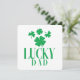 ¡Envía tu amor con un toque de suerte! Esta tarjeta *Papá afortunado* presenta dos tréboles de tres hojas y dos tréboles de cuatro hojas en un diseño verde intenso que celebra al hombre más afortunado que conoces: ¡Papá! Una forma divertida y festiva de desearle un feliz Día del Padre con encanto y alegría adicionales.
