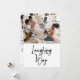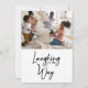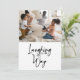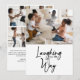 Tarjeta de vacaciones con la frase 'Riendo todo el camino' en letra de pincel y una foto en la parte delantera y cuatro fotos con su mensaje y nombres en la parte trasera. Esta tarjeta será un tesoro y la gente la amará.