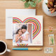 Un corazón arcoíris colorido crea el marco perfecto en esta original y moderna tarjeta de fotos El día de San Valentín. Un saludo sencillo en la esquina completa el diseño. La parte posterior de la tarjeta presenta un patrón de coordinación de rayas rojas, amarillas, naranjas, rosas y verdes.