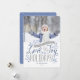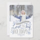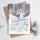 Un personalizado asequible imprimió tarjetas fotográficas de vacaciones con una plantilla sencilla para la personalización. Este alegre diseño presenta elementos florales y una divertida tipografía de estilo con letras a mano en tonos azules y grises de invierno. El texto dice "Que tu corazón se llene de amor y alegría por las fiestas". Personalízalo con tu foto, nombres y el año. El lado inverso tiene un fondo de punto polka lindo o usa el espacio para agregar fotos y texto adicional si es necesario. Utilice las herramientas de diseño para editar los tipos de letra y los colores del texto o agregue más fotos para crear una única tarjeta de fotos navideña.