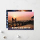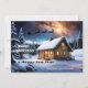 Elegante tarjeta de foto personalizado de Navidades de vacaciones. Puedes reemplazar la foto del frente con tu propia foto personalizado. La parte trasera de la tarjeta incluye un ilustracion de un paisaje invernal clásico con cabaña iluminada por la luz del día y Santa volando por el cielo nocturno.