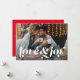 Difunde el mensaje de amor y alegría con esta tarjeta de vacaciones de una sola foto. Con un estilo moderno y audaz en blanco en la parte inferior del marco, este diseño es perfecto para fotos familiares, fotos de compromiso, invitaciones bodas y más de esta temporada de Navidades. La parte de atrás es un rojo festivo.
