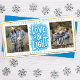 Envíe sus más sentidos deseos a Hanukkah con esta moderna tarjeta de fotos "Amor y Luz", perfecta para celebrar la temporada con familia y amigos. Con una tipografía azul audaz con floridos festivos, un borde de estilo purpurina dorado y un espacio para dos fotos personalizados, este diseño combina la tradición con el encanto contemporáneo. Personalízalo con tu apellido y año para hacerlo único tuyo. ¡Una hermosa manera de compartir calor, amor y luz durante el Festival de las Luces!