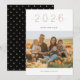 Moderna y elegante tarjeta de fotos de Año Nuevo "2024" dorada. Diseño minimalista con una sola foto. Parte posterior de las características de la tarjeta, patrón de puntos de polka dorado sobre negro.