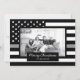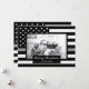 Comparte tus deseos de vacaciones en esta temporada de Navidades con una tarjeta única de fotos personalizada. Este diseño presenta una bandera norteamericana en blanco y negro con una fina línea de gris para decorar la foto de tu familia. Debajo de tu foto hay un área en negro para el sentimiento que dice "Feliz Navidad" y tu nombre familiar que puede ser personalizado. La parte trasera de la tarjeta también tiene la delgada bandera norteamericana de la línea gris para los que son oficiales correccionales. ¡Reemplace la foto mostrada con la suya por un diseño de tipo que su familia y amigos adorarán! Diseñado por el artista ©Tim Coffey. Fotografía © Storytree Studios, Stanford, CA.