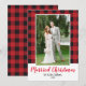 ¡Navidades casados! Celebra las festividades como recién casados con esta hermosa tarjeta de Navidades que incluye tu foto, el fondo de la manta de búfalo rojo y el texto del guión de "Navidades casados". Para una personalización definitiva, cambie el texto a cualquier saludo de vacaciones que desee. La parte posterior de la tarjeta se imprime con el fondo de plástico correspondiente.