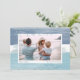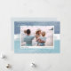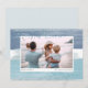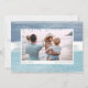 La tarjeta de vacaciones de estilo costero de moda añade un toque náutico a tus saludos navideños. Perfecto para compartir una foto de vacaciones, o para familias que viven en lugares costeros, tropicales, cálidos o isleños, este elegante diseño presenta su foto horizontal o orientada al paisaje favorita sobre un fondo de rayas de color azul y verde marino, con falso purpurina azul en la parte superior e inferior. Añada su mensaje de vacaciones personalizado (que se muestra con "mares y saludos") y sus nombres o apellidos.