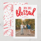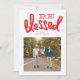 Tarjeta fotográfica de la carta de la mano de los Navidades bendecidos. Rojo, blanco, brillante y feliz. Sé benditos Navidades con asombrosas letras de mano. Una hermosa tarjeta brillante con un bonito respaldo de patrón.