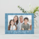 Una elegante tarjeta de fotos para Hanukkah con borde de patrón geométrico azul y menorahs blancos con texto Happy Hanukkah. Añade tu foto favorita y sentimiento adicional en la parte de atrás para un saludo especial de Hanukkah.