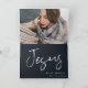 La cédula religiosa de fotografía navideña incluye un guión moderno de pincel blanco sobre un hermoso fondo azul de medianoche.