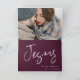 La cédula religiosa de fotografía navideña incluye un guión moderno de pincel blanco sobre un hermoso fondo de morera oscura.