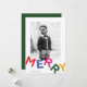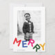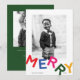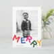 Sumérjase en un mundo de encanto minimalista y alegría vibrante con este encantador diseño de tarjetas de vacaciones. Con un fondo blanco y limpio, la foto de tu personalizado brilla al frente, capturando un momento apreciado que encarna el espíritu de la temporada. Grandes letras mayúsculas, lúgubres y atrevidas forman la palabra "MERRY" debajo de la foto. Cada letra está infundida con un color brillante diferente, creando una exhibición visualmente llamativa que irradia con alegría festiva. Las coloridas cartas bailan alegremente, invitando a los destinatarios a abrazar la alegría y la emoción de la temporada navideña. Debajo de la foto, en una fuente clásica y elegante sans serif, el nombre de tu familia y el año se muestran elegantemente en negro. Este toque sutil añade un toque personal y atemporal al diseño, haciendo de esta carta un regalo muy preciado.