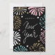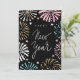 Envíe saludos en Año Nuevo con esta linda tarjeta retro Feliz Año Nuevo. Este diseño presenta un fondo negro con fuegos artificiales de época pastel retro y estrellas de color rosa, marrón y azul. La parte posterior tiene un sencillo borde tricolor en negro, rosa y marrón. Personalice la parte de atrás con una foto propia, un mensaje especial y sus firmas. Ideal para mantenerse en contacto durante las vacaciones, Navidades y el Año Nuevo.