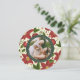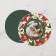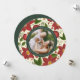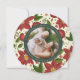 Elegante tarjeta fotográfica de vacaciones en una forma redonda única presenta una foto favorita sobre un patrón de fondo de flores de poinsettia rojo vibrante, follaje botánico verde y flores blancas diminutas. Personaliza con un saludo de vacaciones personalizado (mostrado con "ten unos Navidades alegres"), tus nombres y el año, en blanco sobre un círculo de cazadores verdes.