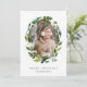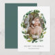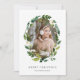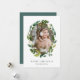 Elegantes tarjetas botánicas de vacaciones cuentan con tu foto favorita rodeada por una corona oval de frondosos follajes verdes y flores blancas. Personaliza con tu saludo personalizado y nombres debajo; se muestra con "Feliz Navidad".