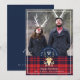 Celebra la época mágica y festiva de las fiestas con nuestras tarjetas de fotos personalizados. Nuestro moderno diseño navideño presenta el mensaje "vivir, reír y divertirse", diseñado en un escudo circular, en un estilo monocírico, con nuestros renos dibujados a mano y arte de antler en oro falso, junto con un monograma personalizado inicial y anual. En la parte inferior se coloca el patrón rojo negrita y marrón. Hemos dibujado a mano unos corpiños de reno rústicos blancos y un falso elemento nasal de purpurina rojo, que se colocan sobre la foto en la cabeza de los individuos y las narices para crear un aspecto divertido y peculiar de carácter animal. Los cánceres de reno y los elementos de nariz roja son opcionales y se pueden retirar o ajustar las posiciones para que encajen en la foto. Simplemente haga clic en el personalizar para personalizar esta plantilla. El reverso presenta un fondo azul marino profundo, con una cabeza de antler de reno de Relieve metalizado falso y un escudo inicial monograma. Todas las obras de arte contenidas en esta tarjeta de fotos de renos rojos de nariz roja enchapada en la marina son obras de arte originales hechas a mano por Moodthology. Se puede personalizar el tamaño del texto, el color del texto, el tipo de letra y la disposición de su preferencia de diseño personal
