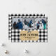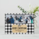 Envíe saludos esta temporada de vacaciones con la calidez y la comodidad del antiguo patrón favorito de manteles de chapa búfala en blanco y negro con elementos rústicos de madera como ramas de abeto y conos de pino. Personaliza con tres de tus fotos favoritas. Parte de nuestra colección 'Rustic Black & White Buffalo Plaid'.