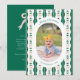Esta encantadora tarjeta de foto navideña de personalizable presenta un fondo festivo de rayas verdes y blancas, así como intrincados adornos y bordes de arco. Muestra tu foto familiar favorita y añade elegancia y calidez a tus saludos navideños.