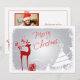 Esta barata y festiva tarjeta de foto roja, gris plateado y blanca de "Feliz Navidad" tiene un ciervo macho con cuernos adornados con bayas y ollas, regalos rojos con cintas, copos de nieve, estrellas y una variedad de árboles de Navidad en un fondo gris niebla con un borde nevado. Puede cargar su propia foto digital en el área de plantilla y personalizar los cuadros de prueba con su propia información y redacción. Si necesita algún elemento coincidente, como un sobre, franqueo o sello para sobres coincidente, envíe un correo electrónico a niteowlstudio@gmail.com con su solicitud.