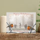 Dos ladrones festivos sentados en ramas cubiertas de nieve. Sube tu propia foto de vacaciones de navidades para reemplazar la que se muestra. Personalizar con su saludo festivo y su apellido. Fotografía cortesía de Storytree Studios. Fotografía © Storytree Studios, Stanford, CA.