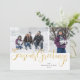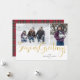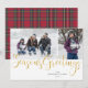 Guión dorado "Saludos de temporada" en falso purpurina con respaldo de patrón rojo tartán, 2 tarjeta de saludo de foto.