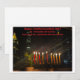 La imagen representa una tarjeta Hanukkah con un paisaje urbano nocturno con una menorah iluminada en primer plano. La menorah tiene nueve velas, todas encendidas, que simbolizan las ocho noches de Hanukkah. La tarjeta incluye el mensaje "Happy, Healthy Hanukkah 2024" y puedes personalizar el texto!