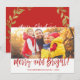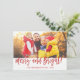 Tarjeta indicada con letras de la foto de la escritura de la mano feliz y brillante del navidad. La foto y el texto de este cepillo puesto letras mano script pueden ser actualizados y modificados para requisitos particulares con su apellido de la foto y. Esta tarjeta también exhibe el apellido y una guirnalda del efecto metalizado de oro en la parte de atrás de la tarjeta de Navidad.