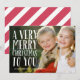 Esta tarjeta festiva, juguetona de la foto del día de fiesta ofrece el texto "las Felices Navidad muy a usted" escrito en una tipografía rústica, caprichosa de moda. El diseño sobrepone una foto del lleno-corrimiento. Las rayas rojas y blancas adornan la parte posterior de la tarjeta.